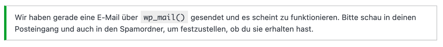 Nach dem Installieren des Plugins oder des Snippets vergewissern wir uns natürlich nochmal via E-Mail-Prüfung im Health-Check-Plugin, ob wir jetzt Mails versenden können und sehen hoffentlich nun diese Antwort: